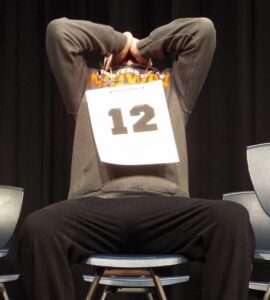 - Eighth-grader Easton Davis reacts Wednesday afternoon after misspelling the word “alfalfa,” which cost him a berth in the Columbiana Exempted School District’s top four that advances to the county spelling bee in March. Davis finished the two-hour contest as an alternate and will advance if one of the other four qualifiers cannot make compete in Lisbon. (Photo by Stephanie Ujhelyi)