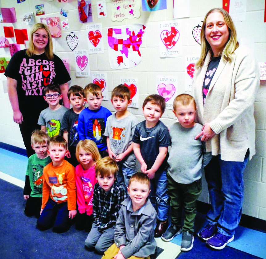 Preschool teachers Lauren Martin and Alicia Cope flank 11 of their students in front of a hallway wall outside Leetonia Bears To Bee’s classroom at the Leetonia K-12 school building. Students pictured in no particular order include Daniel Guappone, Jack Talbott, Everleigh Bequeath, Gavin Rinto, Levi Gardner, Nathan Yerkey and Sal Shar, all of Leetonia; Payton Johnson, of Washingtonville; Hendrix Boyett and Beau Huston, both of Salem; and Callum Sferra, of New Middletown. (Photo by Stephanie Ujhelyi)