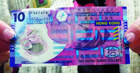 Per the conversation rate, a 10 Hong Kong dollar bill is the equivalent of $1.27 U.S. dollars,