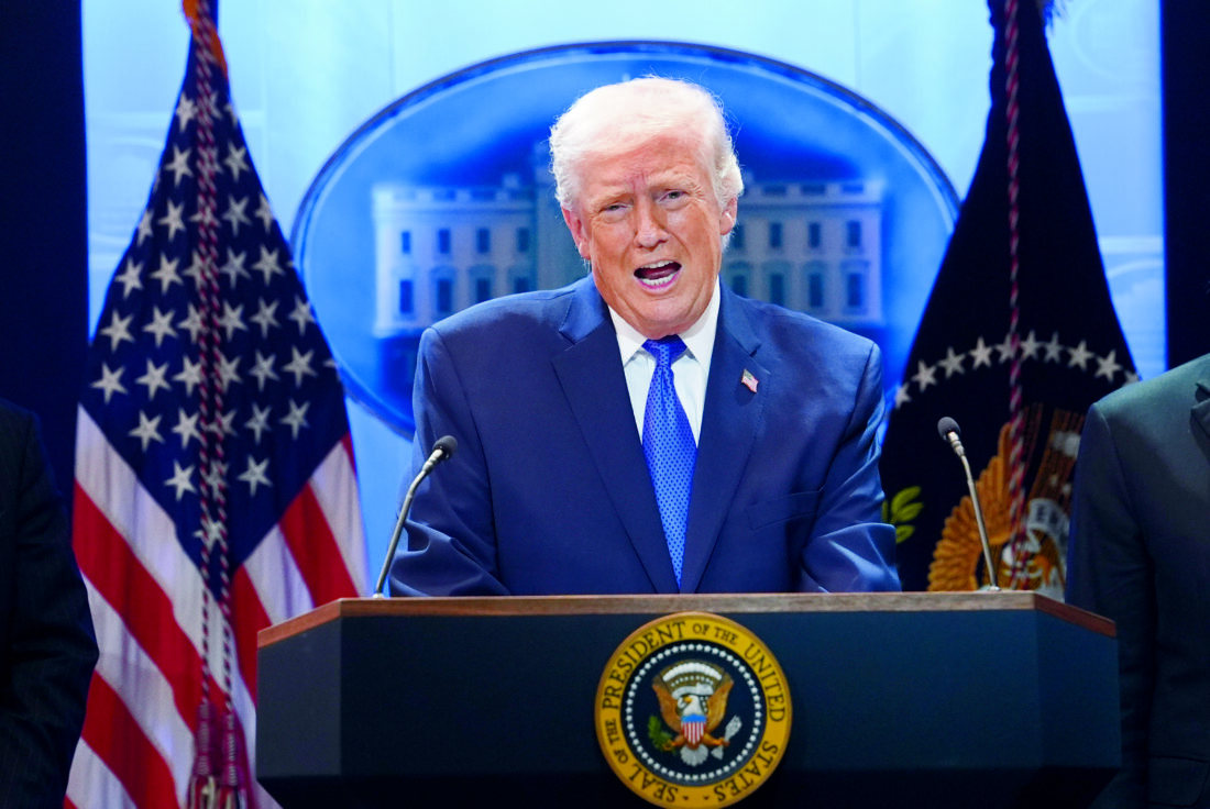 President Donald Trump speaks during a press briefing at the White House, Friday, Feb. 20, 2026, in Washington. (AP Photo/Evan Vucci)