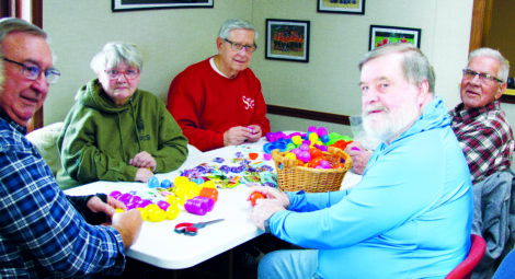 The dedicated team of volunteers from the First Christian Church’s Koinonia Sunday School has prepared more than 12,000 eggs by hand for the annual Salem Parks Department and Berkshire Hathaway HomeServices Stouffer Realty Easter egg hunt for the last five years. Each year they begin preparations months in advance and have already begun work for 2026, meeting for the second time this year on Tuesday. Shown from left are Cliff Votaw, Alice Baker, John Panezott, Jerry Hetrick, and Ernie Maenz. Not pictured are Dutch Clunk, and Patty Pim. (Photo by Morgan Ahart)