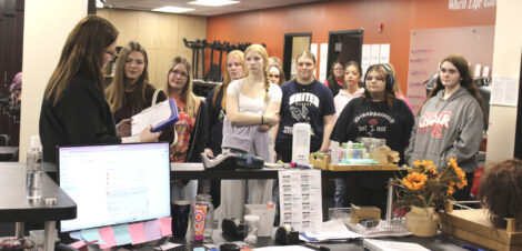 Ariana Gilpin, junior, Columbiana High School, and student in the CCCTC Cosmetology Programs shows sophomores interested in the program around the cosmetology lab. (Photo by Kristi R. Garabrandt)