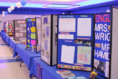 Displays of each program and academic class offered at CCCTC line the cafeteria during the CCCTC Sophomore Showcase. (Photo by Kristi R. Garabrandt)