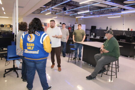 - Precision machining and manufacturing (PMM) instructor Michael Hughes talks with parents and students about what they can expect from the course if they are accepted into it. (Photo by Kristi R. Garabrandt)