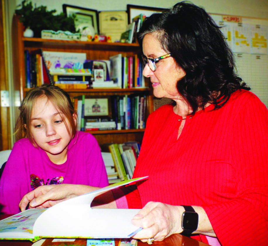 - Joelle Densmore, a fourth-grade student at Joshua Dixon Elementary School, reads a book with her principal Dr. Kim Sharshan. Densmore selected the book from a small library in Sharshan’s office. (Photo by Stephanie Ujhelyi)