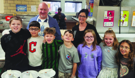 Two of Columbiana school district’s top administrators celebrate PBIS-Pax Pancakes Day with the Joshua Dixon Elementary School’s Principal Advisory Committee. Columbiana district superintendent Dr. Don Mook and Joshua Dixon school principal Dr. Kim Sharshan (also assistant superintendent) stand behind committee members, pictured from left, Hank Irwin, Braden Gustafson, Nico DeMaiolo, Maddox Rust, Ellie Carvelli, Taya Pike and Piper Vennetti. (Submitted photo)