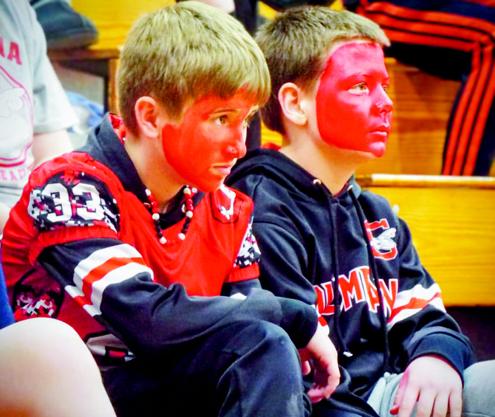 Wyatt Scheks and Aiden Barker, fifth-grade students at Columbiana Middle School, did up the school spirit for Friday morning assembly with painted faces in the school colors. The district was celebrating the latest accomplishment for its middle school, which was attended by various city, state and federal officials as well as students from grades 4-8. (Photo by Stephanie Ujhelyi)
