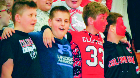 - From left, Columbiana fifth-grade students Grady Aikens, Bradyn Aikens, Wyatt Scheks and Aiden Barker sway to the sounds of Columbiana’s school alma mater during the conclusion of Friday morning’s assembly celebrating the school’s latest accomplishment. (Photo by Stephanie Ujhelyi)