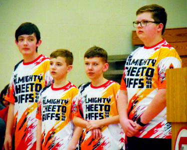 - Members of Columbiana’s world qualifying robotics team the Almighty Cheeto Puffs, pictured in no particular order, Colton Burns, James Conrad, Parker Clark and Sammy Harberson. The team’s was recognized Friday during an assembly, celebrating Columbiana Middle School accomplishments and spotlighting the district’s highly successful robotics program. (Photo by Stephanie Ujhelyi)