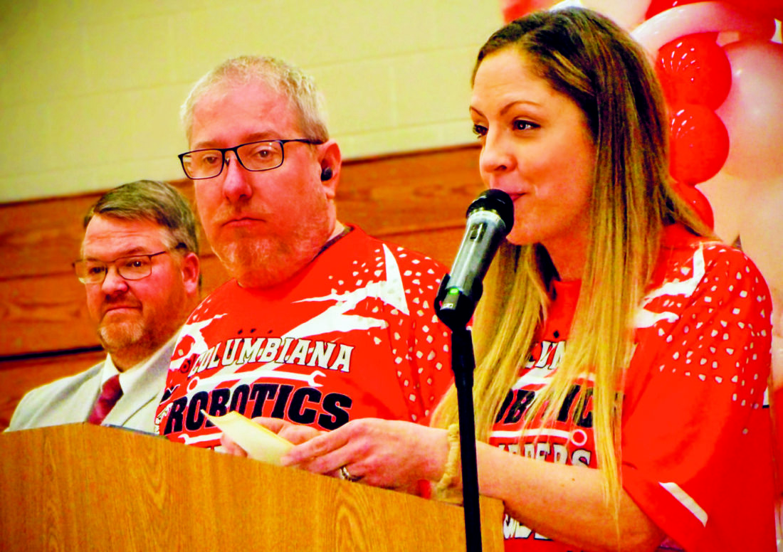 - From right, Columbiana robotics coaches Ashlee Sherwood and Justin Conrad share information about their highly successful program within the district’s elementary and middle schools Friday morning during the district’s celebratory assembly, as middle school principal Dr. Jason Martin looks on. The robotics’ program, which had four teams advance to the state tournament with one successfully continuing to the worlds. (Photo by Stephanie Ujhelyi)