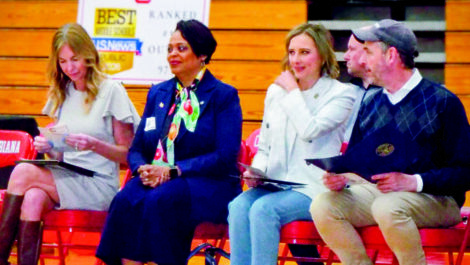 From left, Youngstown State University provost Dr. Jenn Adams, Monique Moore from Gov. Mike DeWine’s office, State Rep. Monica Robb Blasdel and Congressman Michael Rulli were all on hand Friday morning at Columbiana Middle School’s celebratory assembly to present proclamations honoring their continued academic accomplishments. (Photo by Stephanie Ujhelyi)