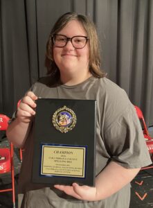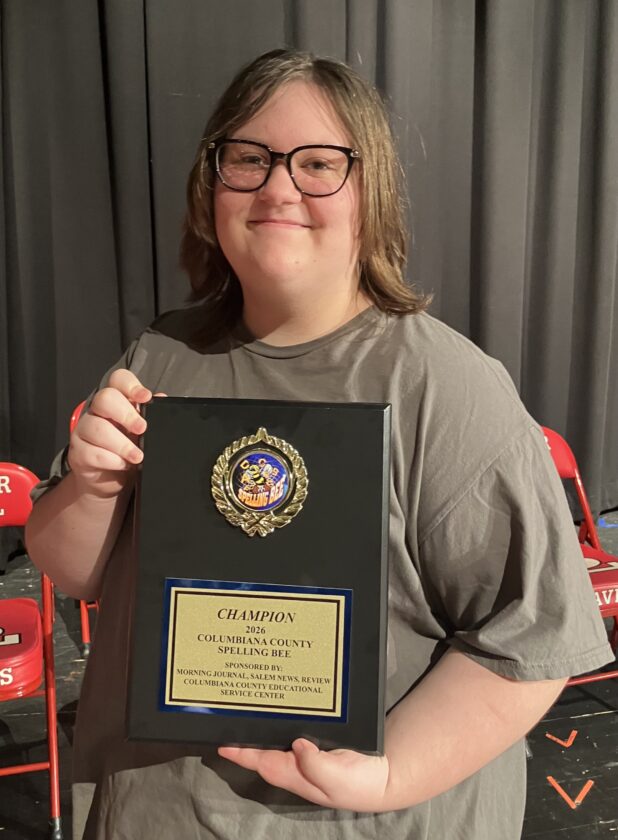 - Caitlin Clonch, 14, an eighth grader at Crestview, holds the championship plaque for the Columbiana County Spelling Bee. Her school will now receive the county spelling bee traveling plaque after her name is engraved as the 2026 champion. (Photo by Mary Ann Greier)