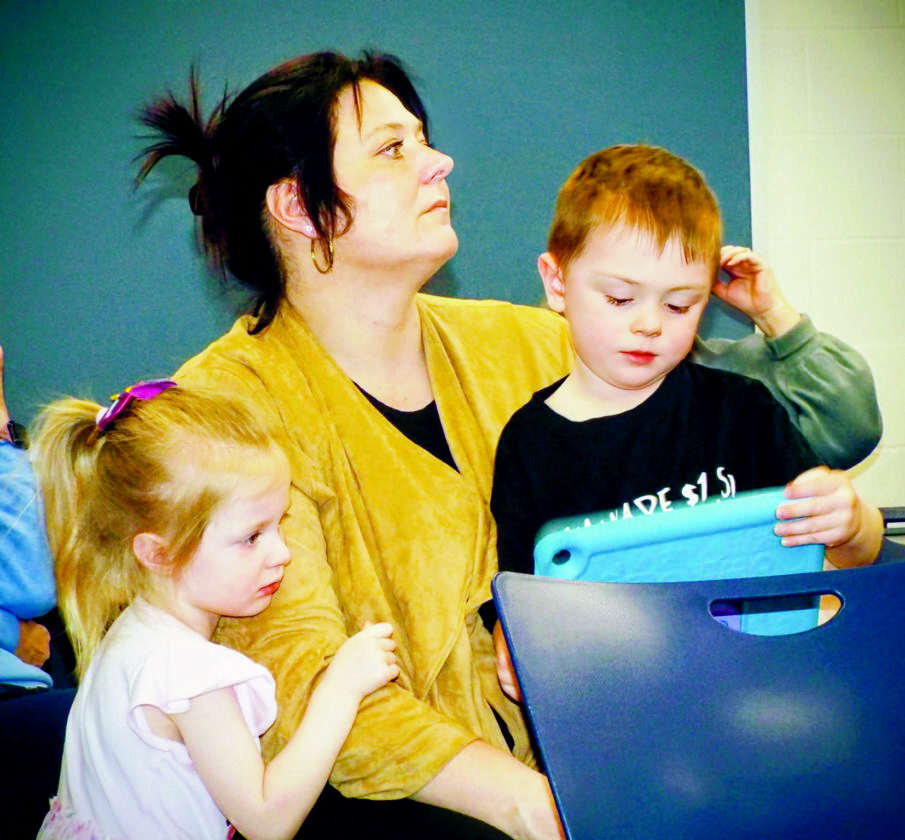 - Stacey Goodyear, center, is flanked by her children, 5-year-old Sophia and 4-year-old Gavin. They were among the attendees at Wednesday’s community chat regarding proposed busing changes at Leetonia school district. (Photo by Stephanie Ujhelyi)