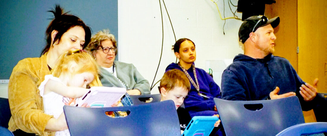 At left (front row), Stacey Goodyear holds Sophia, 5, while audience members that include 3-year-old Gavin and Frank Rinto listen to Leetonia school superintendent Tony DelBoccio detail proposed changes to the district’s busing for next year Wednesday afternoon. (Photo by Stephanie Ujhelyi)
