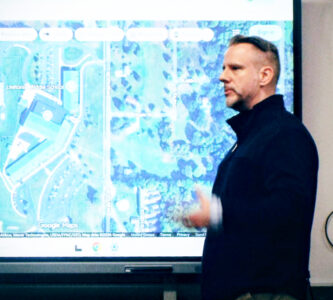 - Leetonia school district superintendent Tony DelBoccio stands at a smart board displaying an overhead of the campus, as he discusses drop-off and pickup details regarding proposed changes to district busing Wednesday afternoon during a community meeting. (Photo by Stephanie Ujhelyi)