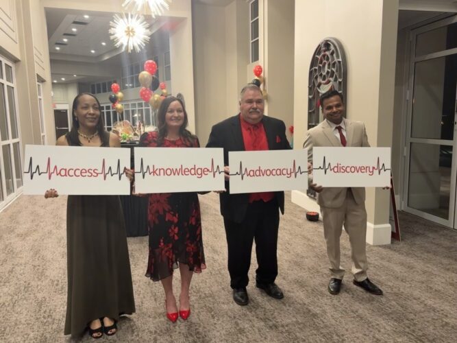 Four attendees of the Tri-County Heart Ball on Saturday at Waypoint 4180 in Canfield used the idea of the four chambers of the heart to show the American Heart Association’s focuses: access, knowledge, advocacy and discovery. From left are Gina VanCant, Project Milk Mission CEO/Founder and American Heart Association Social Impact Funds recipient; Amy Kren, Trumbull County heart attack survivor and former Woman of Impact nominee; Mike Kerr, Trumbull County CPR instructor and Heart Powered volunteer; and Dr. Praveen Venkatachalam, Mercy Health neurologist. (Submitted photo)