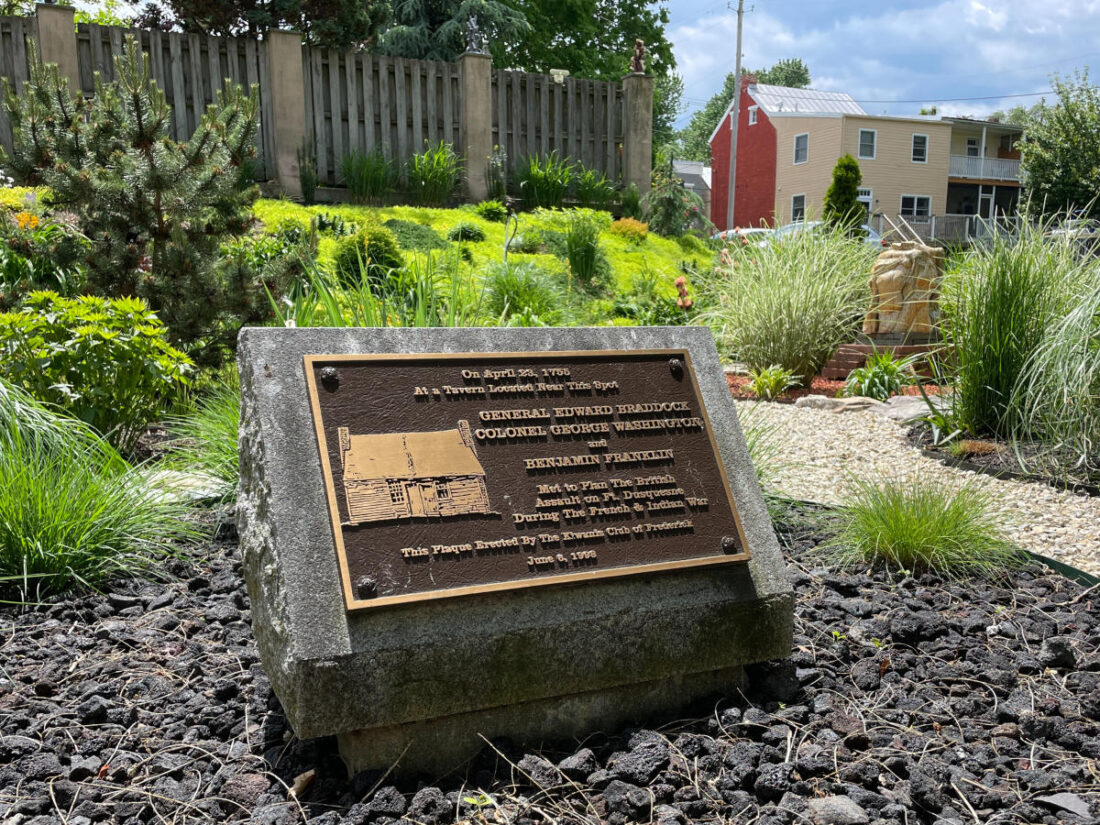 - This plaque in Frederick, Md., highlights the 1755 meeting between Gen. George Braddock, then-Col. George Washington and Benjamin Franklin sits near the spot in Frederick where they met to discuss plans to attack Fort Duquesne at Pittsburgh. (Photo courtesy of Visit Frederick)
