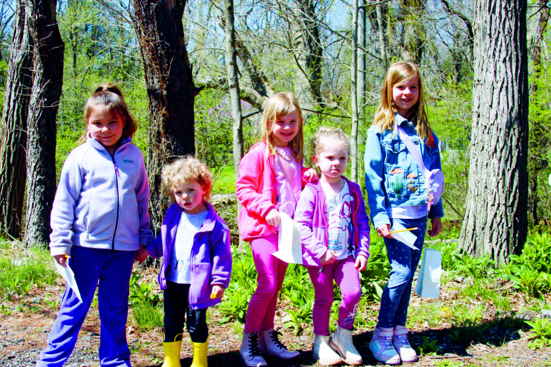 The Salem Public Library and Parks Department hosted a “sensory scavenger hunt” at the Waterworth Memorial Park Nature Trail Saturday. Participants looked for items matching clues based on all five senses like items of a specific color or texture, or that had a particular odor or that made a particular type of sound. Shown from left are Kalista Gagnon, 7, Salem; Cecelia McKinney, 2, Leetonia’ and Tenley, 6, Emery, 3, and Teagan Spillan, 8, all of Salem. (Photo by Morgan Ahart)