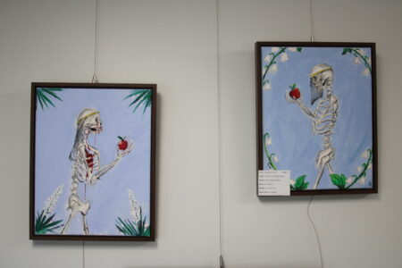 Shown are a pair of paintings in gouache paint titled “Story of Eden” by Wellsville Junior Alexzander Chase. (Photo by Morgan Ahart)
