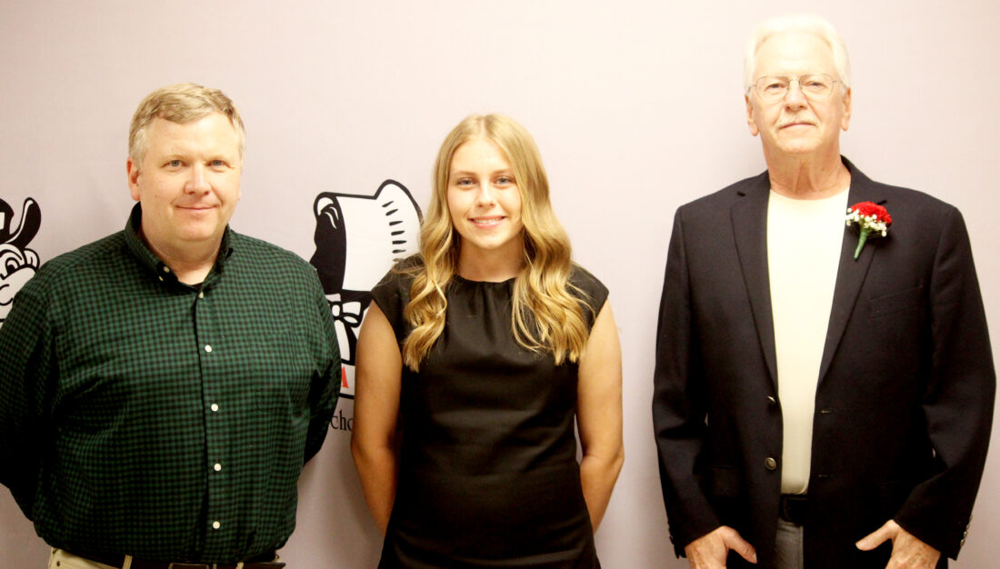 - The first Cindy O’Brian Memorial Education Scholarship was presented to Memphis Haueter Saturday. Cindy’s husband, Doug, and son Mike, were in attendance to see the first scholarship presented. Shown from left are Mike O’Brian, Haueter, and Doug O’Brian. (Photo by Morgan Ahart)