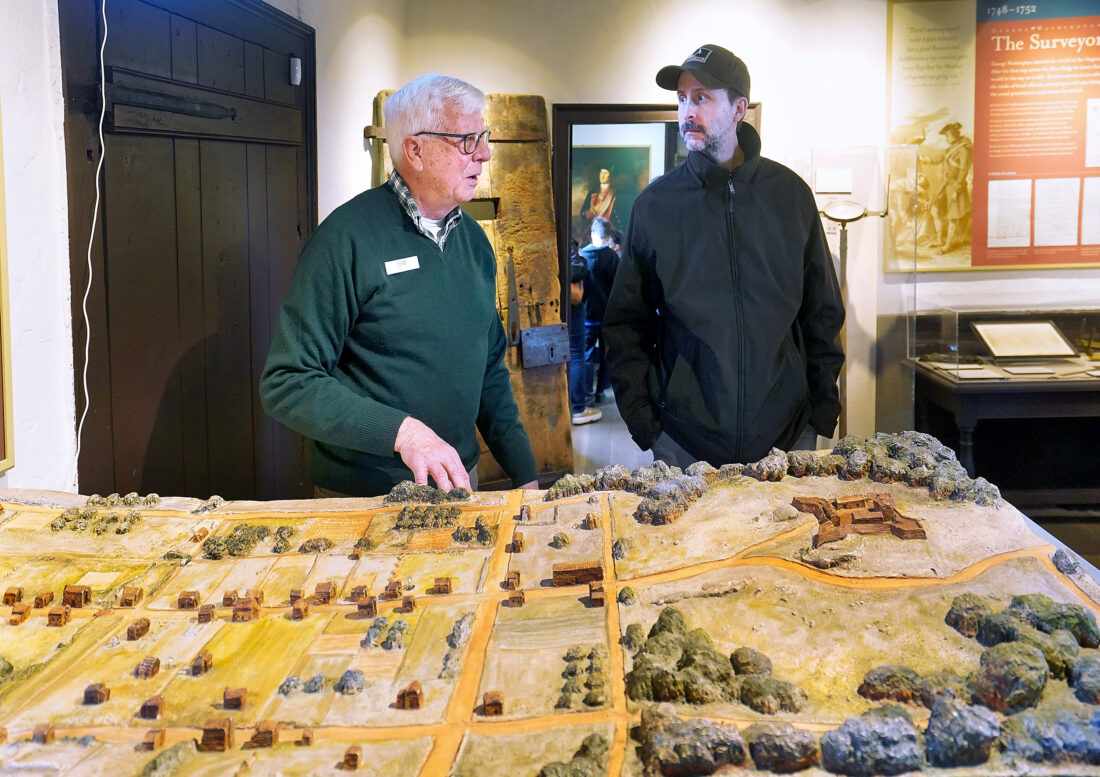 - Gene Schultz, left, a volunteer at George Washington’s Office Museum, talks with visitor Brian Armel about what Winchester, Va., was like in the mid-1700s. In front of him is a scale model of Winchester circa 1755, when George Washington was overseeing the construction of Fort Loudoun in Winchester. The fort is on the far right of the model. All that remains of the fort is a well. (Photo by Ginger Perry/Special to The Winchester Star)