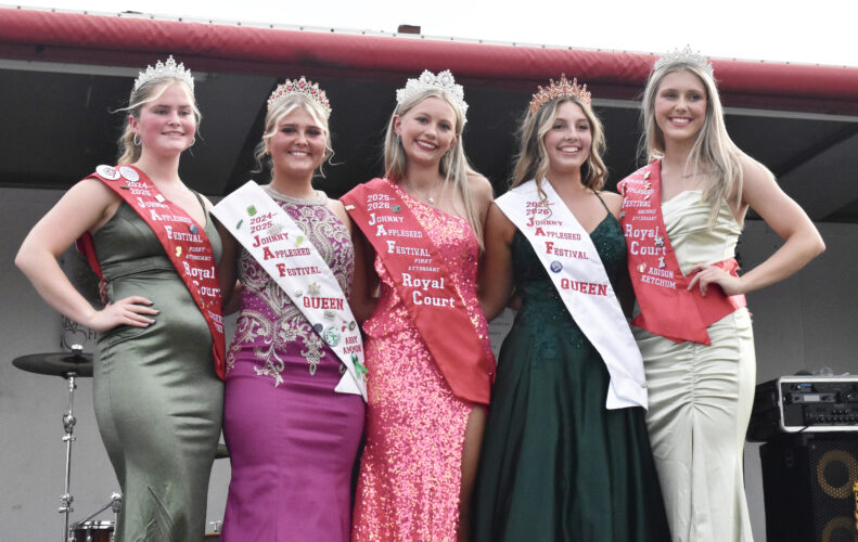 Adelyn Butream was crowned the 2025 Johnny Appleseed Festival Queen to close the festivities. Olivia Fennema was crowned First Attendant. Pictured from left are 2024 First Attendant Kady Dunn, 2024 Queen Abby Ammon, Fennema, Butreamm and 2024 Second Attendant Adison Ketchum. (Photo by Stephanie ...