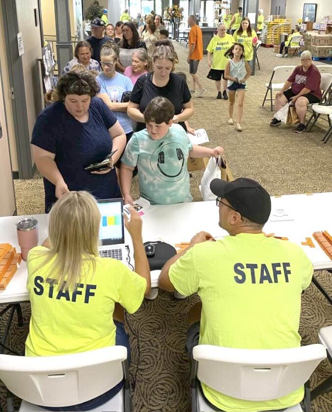 Associate Pastor Ben Cope, right, and his wife, Kelly, assist patrons lined up in the lobby of Abundant Life Fellowship to register for school supplies during last year’s August Overflow community outreach event. This year’s Overflow is scheduled for noon to 4 p.m. Aug. 5. For questions, call 330-457-7317. (Submitted photo)