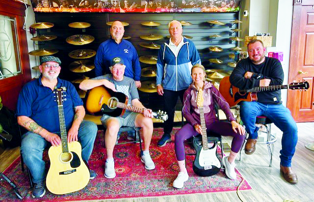The Perry Township trustees presented a $500 donation to the Salem chapter of Guitars 4 Vets at the Salem Music Center Sunday, one of three $500 donations being made to local nonprofits through the Northeast Ohio Public Energy Council (NOPEC) Community Sponsor Grant. Guitars 4 Vets is a non-profit which offers a 10-week music therapy program for area veterans which teaches and equips participating veterans to express themselves through music at no cost. Shown from left are Sean Hart, Don Wood, Trustees Jim Armeni and Tony Ieropoli, Emmy Prison, and Josh Mighell. (Submitted photo courtesy of Jim Armeni.)