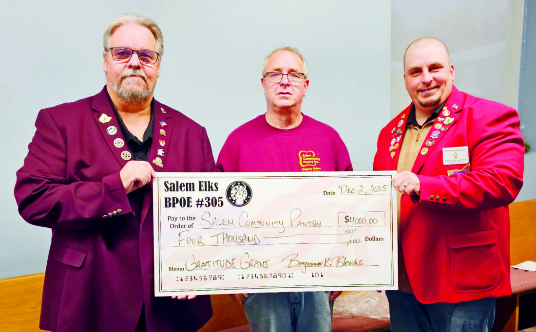 The Gratitude Grant was obtained by Pam Gorby, the ENF Chairperson, who wrote up the proposal and submitted it to the Elks National Foundation CIP department for approval for use by Salem Elks Lodge #305. This grant totaled $4,000 and presented to the Salem Food Pantry by Mike Reich, Loyal Knight to the Director Terry Kerchum with the help of Ben Blevins, Exalted Ruler. The lodge is hoping that this will help local families with celebrating the upcoming holidays. (Submitted photo)