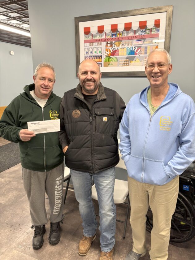 The Stitle Construction Company of Salem presented a check for $2,500 to the Salem Community Pantry to purchase food for the holiday season. Pictured from left are Terry Ketchum, pantry director; Eric Stitle of Stitle Construction; and Brian Konya, secretary to the pantry board of directors. (Submitted photo)