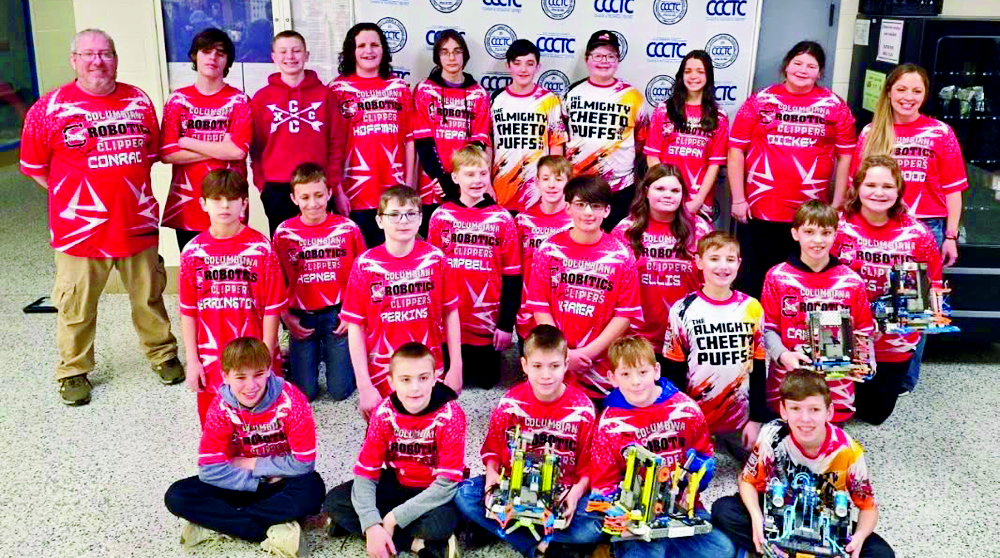 Three Columbiana robotics teams advanced to state competition for the first time in district history. Pictured are representatives from the middle school’s Almighty Cheeto Puffs; and both elementary school teams, the Birb Gang and Purple Pringles with their trophies. Earlier this season, the Birb Gang won the Design Award on the way to qualify for the elementary state champion, while the Purple Pringles secured a state birth through their high Driving and Autonomous Score. At the middle school robotics finals on Saturday, Feb. 21, at the Columbiana County Career and Technical Center qualifier, the Cheeto Puffs won first place in Teamwork Matches and in Robot Skills as well as brought home the Innovate Award Trophy to advance to the March2-3 VEXIQ Ohio State Robotics Championship in Dayton. (Submitted photo)