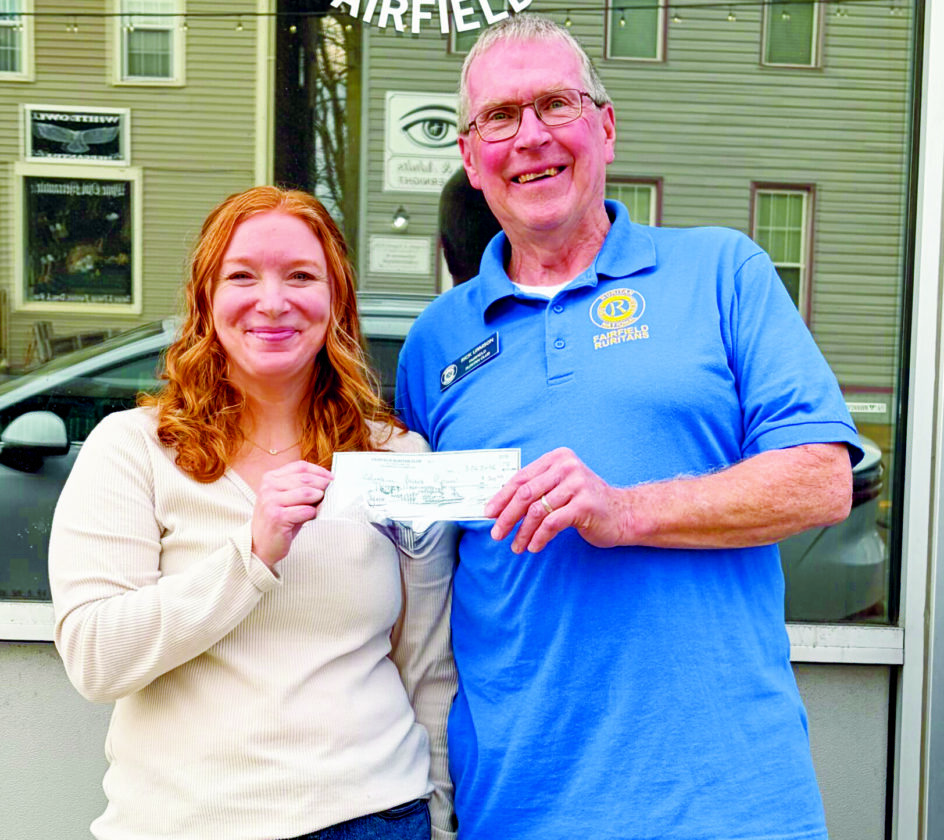Rick Urmson, Fairfield Ruritan Club president, presents a donation to Lauren Angel-Wiley of Columbiana Project Playground. “Construction on the new, inclusive playground is underway. The group continues to strive toward their goal of the playground’s completion in time for summer play. This timeline will not be possible unless the remaining $80,000 is urgently raised for the turf surfacing,” according to Angel-Wiley. Visit www.playatfirestone.com for information and available new sponsorships. (Submitted photo)