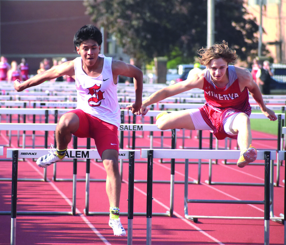 Salem’s Daniel Marin and Minerva’s Caden Stewart compete in the 110-meter hurdles in the Eastern Buckeye Conference meet at Sebo Stadium in Salem. (Photo by Ron Firth)