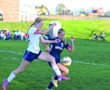 Rootstown’s Haley Dick and United’s Maddie Figley (9) battle for control of the ball on Monday at United.