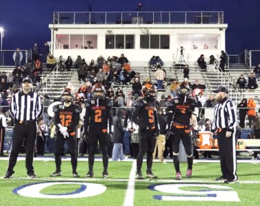 Southington football captains Colt Levensky (32), Tanner Kelson (2), Ethan Stewart (5) and Ethan Bosch (3) line up for the Ohio High School Football Coaches Association’s 8-man football state championship game Saturday night at Leetonia High School. (Salem News/Lowell Spencer)