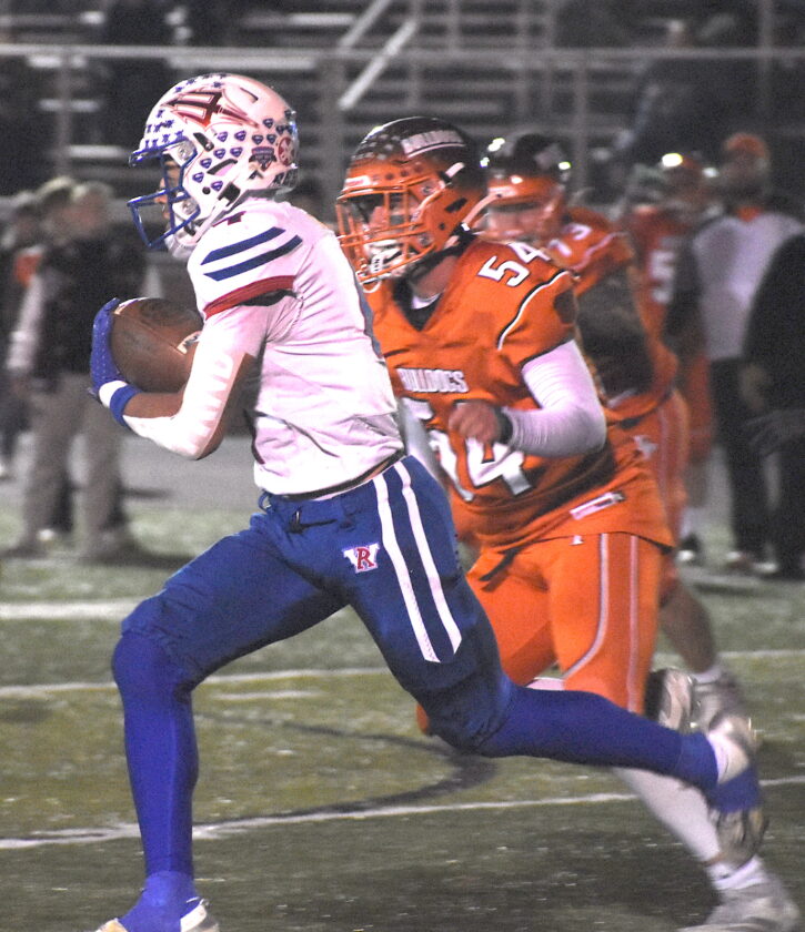 Western Reserve’s Nate Alexander runs for a touchdown as East Palestine’s Avyre Klingensmith gives chase on Friday in East Palestine. (Photo by Ron Firth)