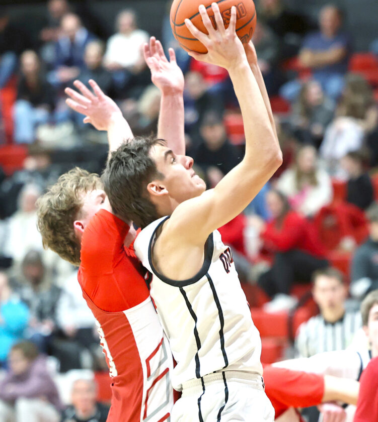 Salem’s Jack Andres shoots as Minerva’s Kellen Troyer goes for the block on Friday at Salem. (Photo by Gary Leininger)