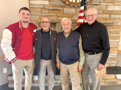 From left, Youngstown State University quarterback and Walter Payton Award winner Beau Brungard, Youngstown State University coach Doug Phillips, Salem area philanthropist Bob Sebo and former East Palestine athletic director Jim Wilson pose for a photo on Monday at the Curbstone Coaches luncheon at the Avion Banquet Center. (Photo by John Butera)