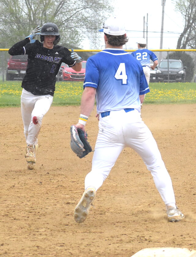 Heartland Christian’s Paul Bender runs to third as Lisbon’s Ashton Hinchliffe covers third on Thursday at the Dickey Complex