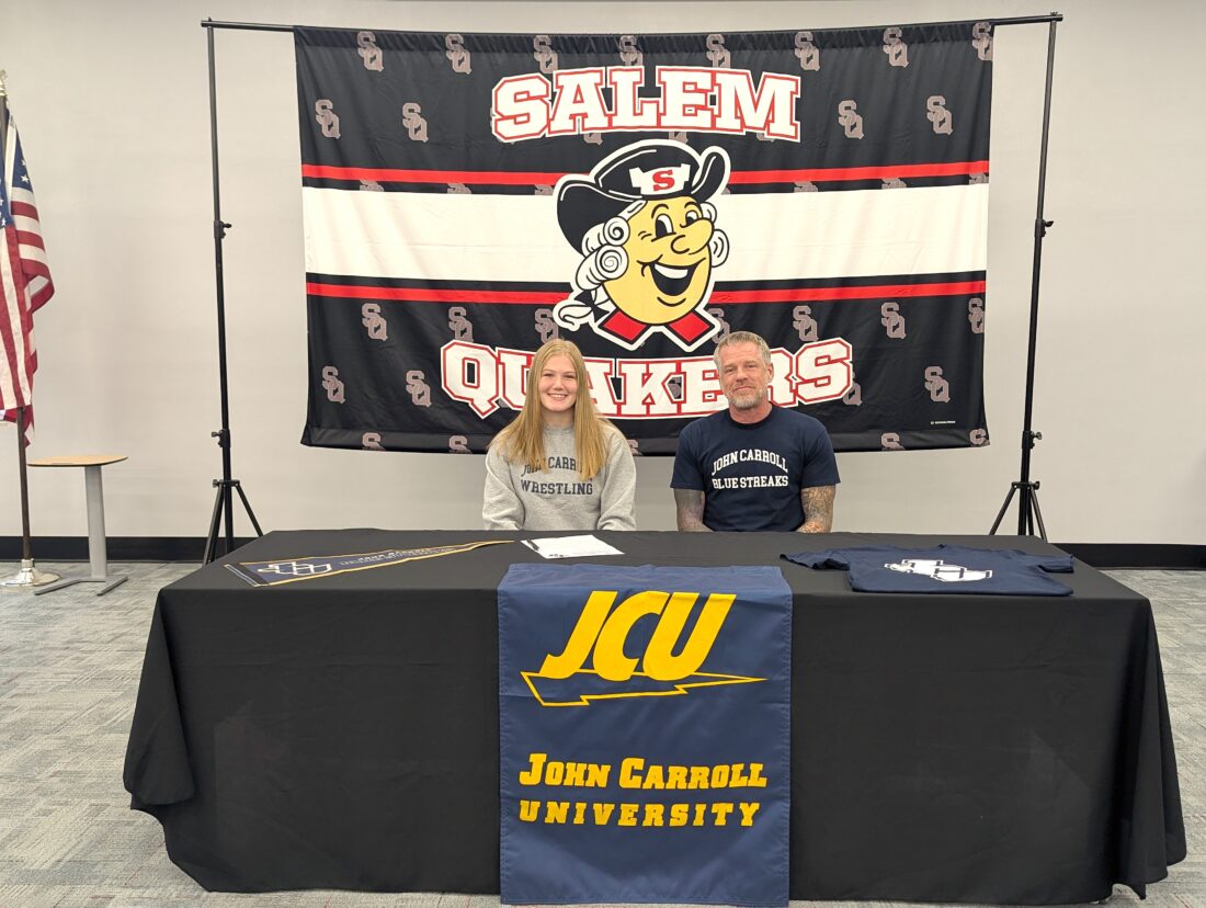 Salem senior Paige Menough will continue her academic and wrestling career at John Carroll University in the fall. She is pictured with Salem head wrestling coach Drew Hart. (Submitted Photo)