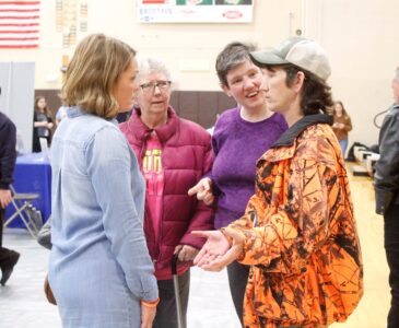 East Palestine residents Nancy, Kelly and Donna Felger address their concerns with Anne Vogel, director of the Ohio Environmental Protection Agency, during the EPA’s open house at East Palestine High School on Thursday. (Photo by Stephanie Elverd)