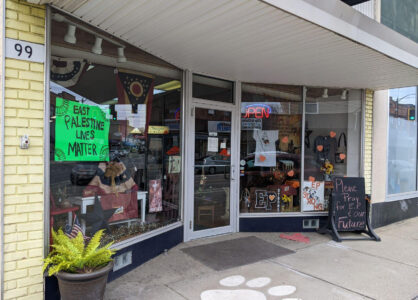 Another storefront painted “EP STRONG” in the window. Passersby can see “Please pray for EP and our future” and “East Palestine Lives Matter” in the window at Flowers Straight from the Heart, a florist beside the Dollar General and the municipal office.